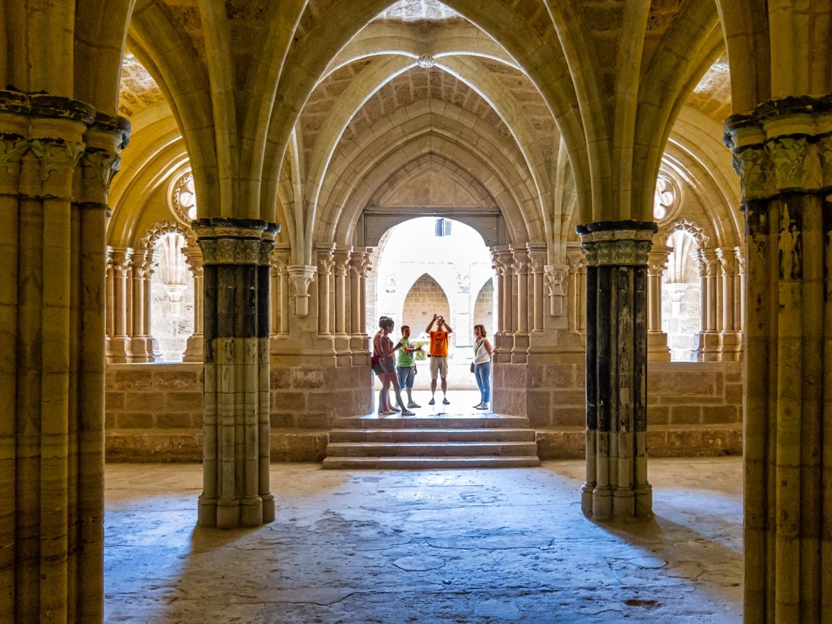 Del enclave defensivo existente en el lugar con anterioridad al monasterio, el viejo “castrum Petrae”, quedan lienzos del recinto amurallado y una torre del homenaje que aún conserva su matacán. Ya en el conjunto monástico, que sigue escrupulosamente las pautas marcadas por el Císter, accederemos al precioso claustro, con sus galerías de arcos apuntados decorados con relieves. A él se asoman la sala capitular, con su triple portada esculpida, el refectorio y calefactorio, la cocina, las bodegas y cilleros y, finalmente, en la panda norte, la iglesia. A diferencia del resto de las dependencias, esta última se encuentra en ruinas; son, sin embargo, ruinas consolidadas de estampa romántica que dejan ver aún el esplendor de lo que fue este grandioso espacio en el siglo XIII: un gran templo de tres naves y tres ábsides, de austera decoración pero impecable pureza de líneas constructivas, grandes ventanales y rosetones calados, robustos pilares que un día soportaron las bóvedas de arista. También se conserva la portada principal, en arco de medio punto con arquivoltas, y una capilla barroca en un extremo del crucero, cubierta de decoración en relieve y la cripta.